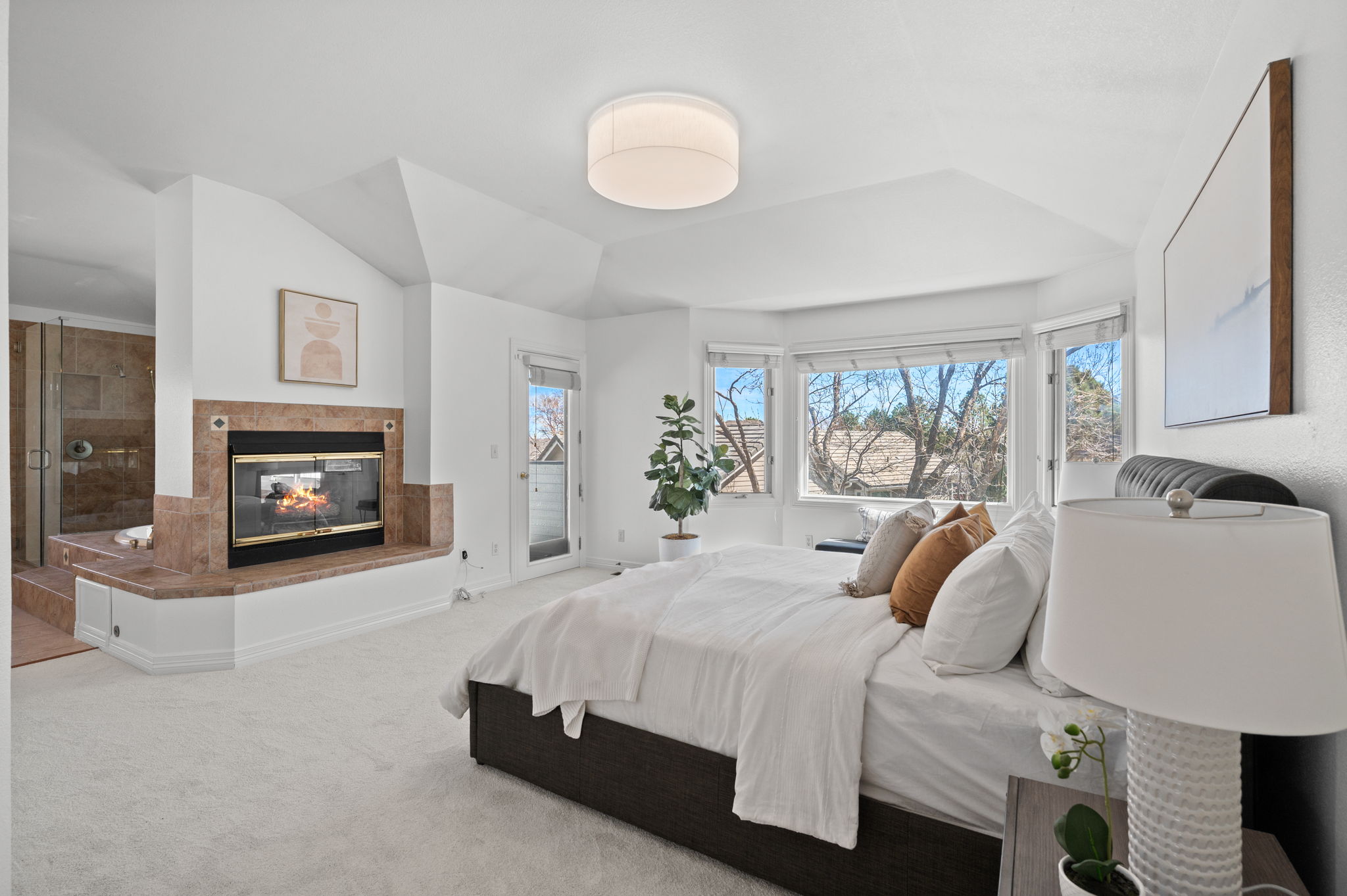 The upper level primary suite is a true retreat — a double-sided fireplace shared between the bedroom and spa-like en suite bathroom, dual vanity, separate shower, jetted tub, walk-in closet, and a private deck with tree-framed views toward Cherry Creek Reservoir. Three additional generously sized bedrooms share the upper level, boasting en-suite and jack-and-jill full bathrooms. An open loft landing overlooks the family room below, where a beautifully accented gas fireplace anchors the space and windows frame the views beyond.