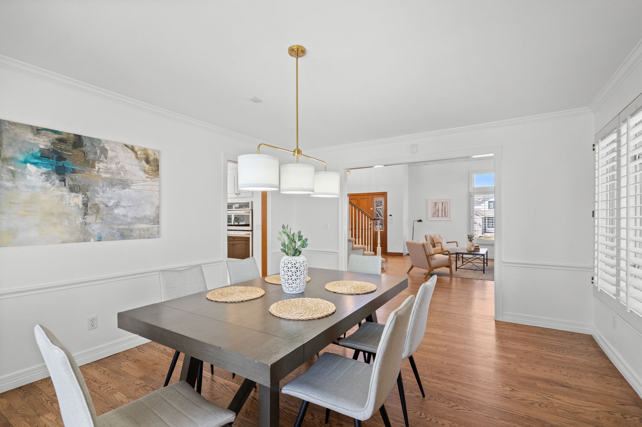 The main level offers an open, light-filled floor plan with high ceilings, plantation shutters, and abundant natural light that flows seamlessly to a wraparound deck with backyard access. A private office with French doors, a kitchen with stainless steel appliances and new gas range, and separate eat-in space complete the main level.